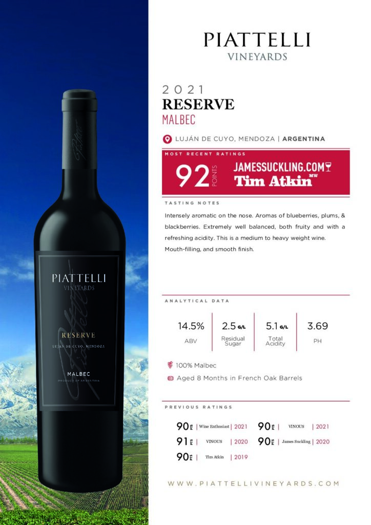 A super-premium wine cloaked in a premium bottle, the deep burgundy hues and lingering fruit aromas makes the Premium Reserve Malbec not just memorable, but unforgettable. Groomed to be a super-premium wine cloaked in a premium bottle, Piattelli Premium Reserve Malbec inspires even the most passive wine consumer to sit up and take notice. The elegance of this sleek, iconic bottle is only surpassed by the excellence of the flavorful, fruit-forward wine it contains.